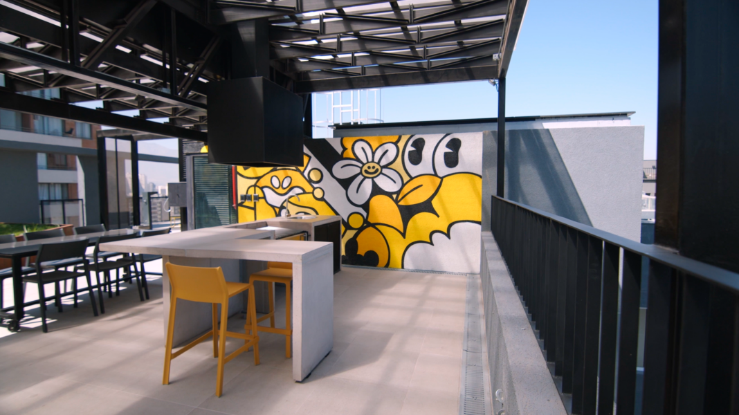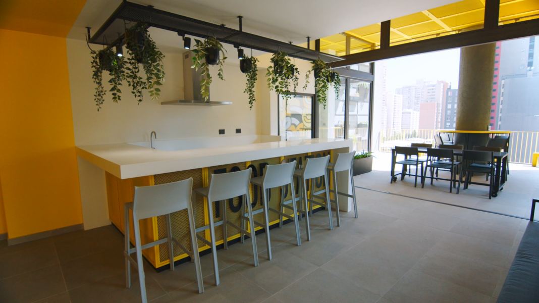 entrada que se presenta como una extensión de la calle. Por sobre el edificio, conectando sus últimos niveles, diseñamos un gran espacio exterior como núcleo de encuentro, flanqueado por el recubrimiento del edificio que conecta tres niveles a modo de paseo o circuito de actividades. En este núcleo ascendente, se relacionan los distintos espacios como el salón gourmet, áreas de vegetación, quinchos, gimnasio exterior, anfiteatro y balcones exteriores que observan la ciudad, todos dispuestos a ser habitados en esta plaza elevada.