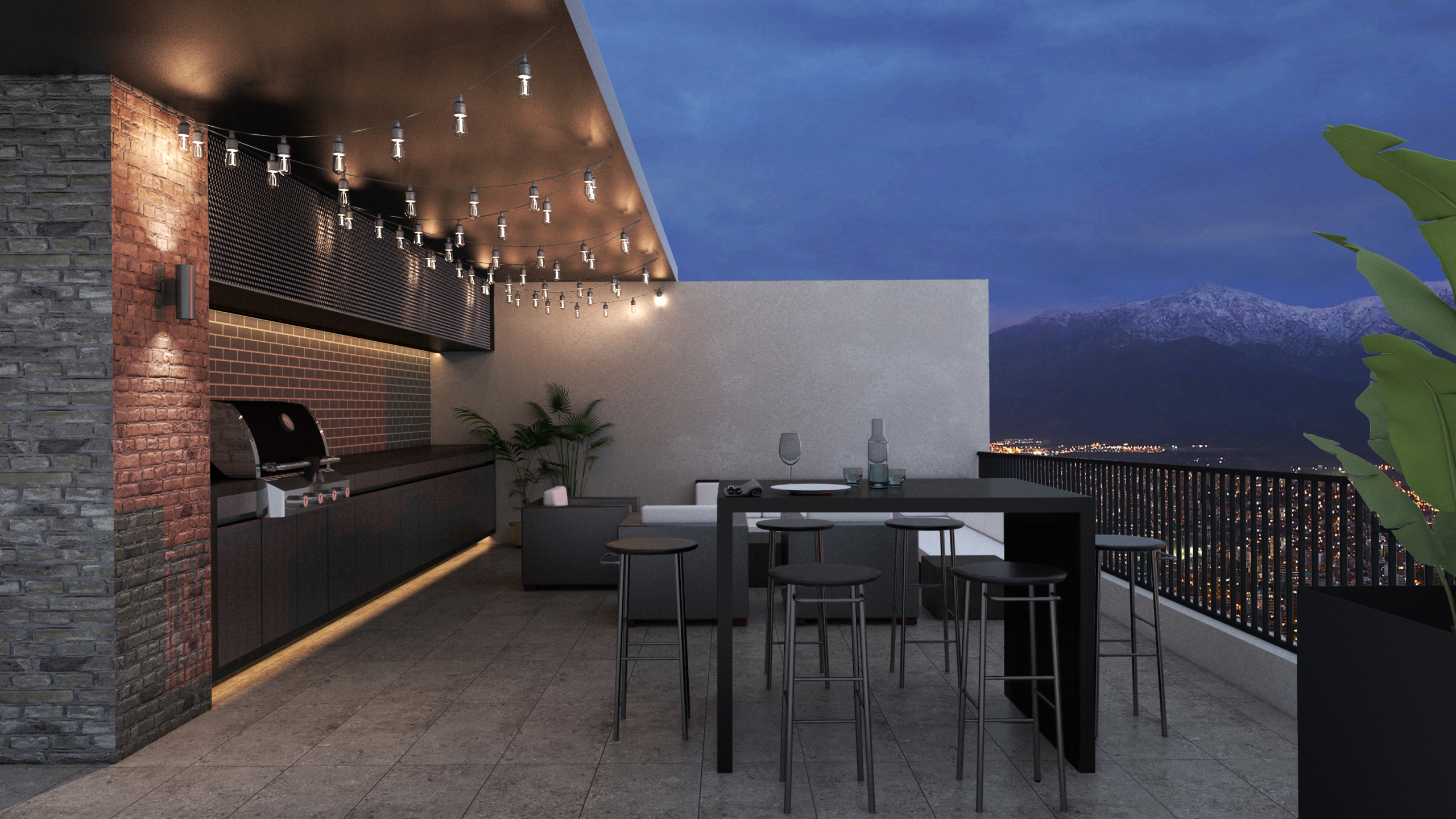 Espacios comunes: Piscina, Quinchos, Terraza Lounge, Sala CoWork ,Sala de Juegos y Sport Bar, Pool Bar , Lavandería con sala de estar, Estacionamiento de bicicletas, Gimnasio, Salón Gourmet.