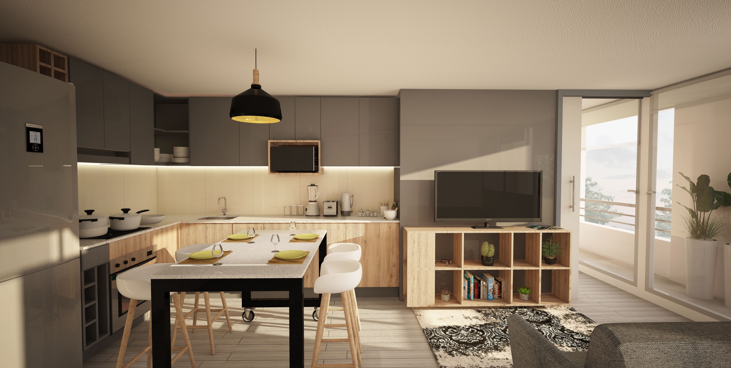 Características y terminaciones: piso gres porcelánico tipo madera, puerta de acceso principal enchapada en madera, ventanas termopanel, cocina equipada con horno, campana, encimera Vitrocerámica y cubierta de Quartz Stone. Proyecto Full electric con termos individuales.